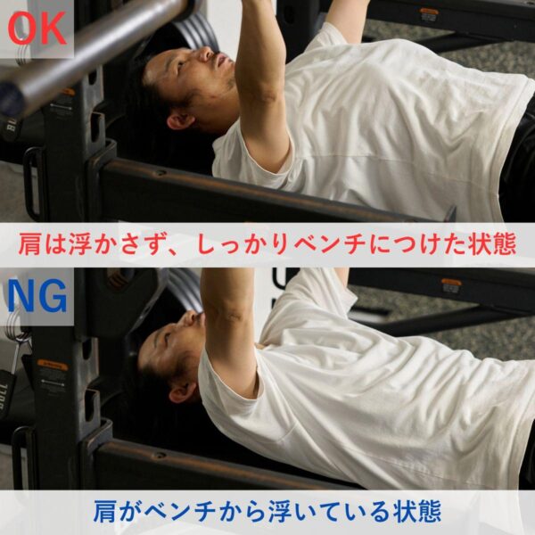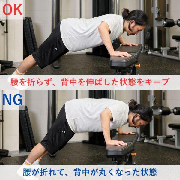 重さを上げたい気持ちが先行すると、無意識に体を反らせたり、ボトムから勢いで上げようとしてしまいます。疲れてくるほどテンポが速くなり、胸より肩や腕の介入が増えるのを感じました。