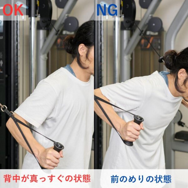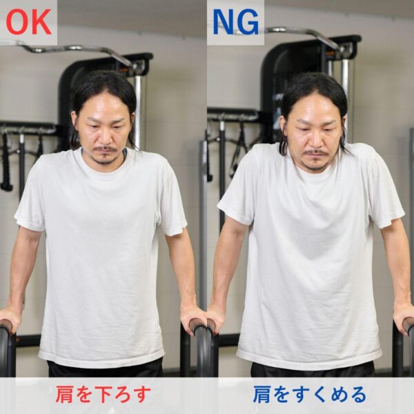 下部に効かせるためには、肩がすくんだ状態を避け、肩甲骨を下げたまま動作することが大切。肩が前に出ると三角筋に負荷が逃げてしまうため、胸を張り、肩を落とした姿勢を保つと下部をしっかり使える。