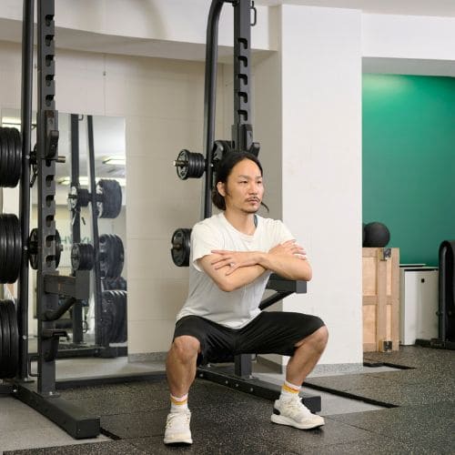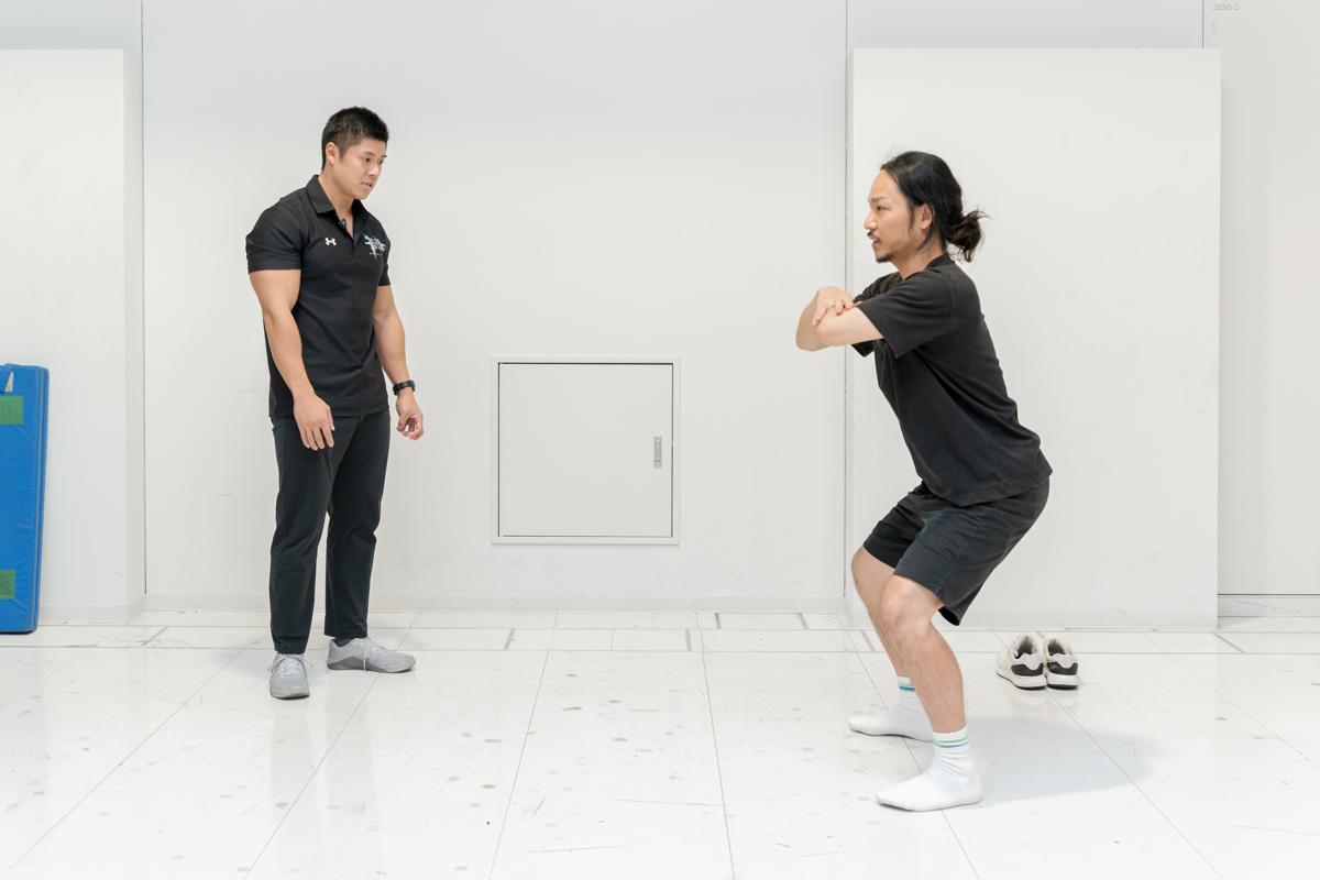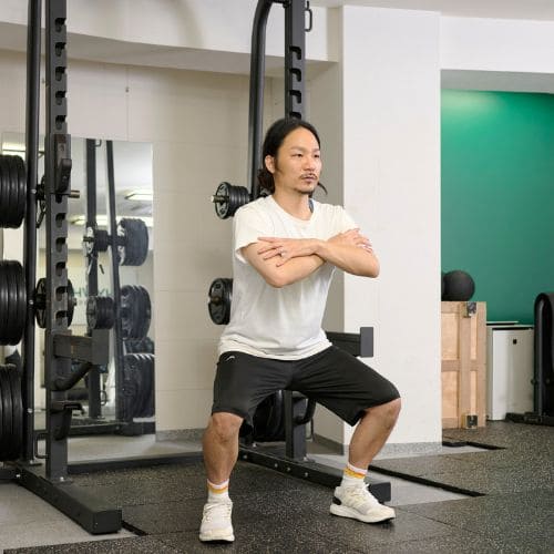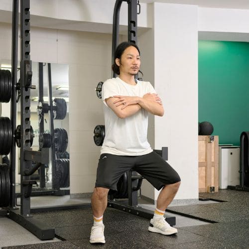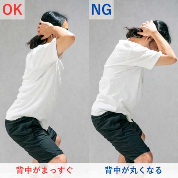 しゃがみの深さは大腿が床と平行を目安といわれていますが、股関節の柔軟性によって可動域は変わってきます。腰を落とす幅よりも、ひざが内側に入らないよう注意して自分に適した可動域で取り組みましょう。