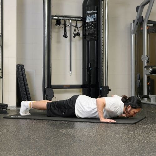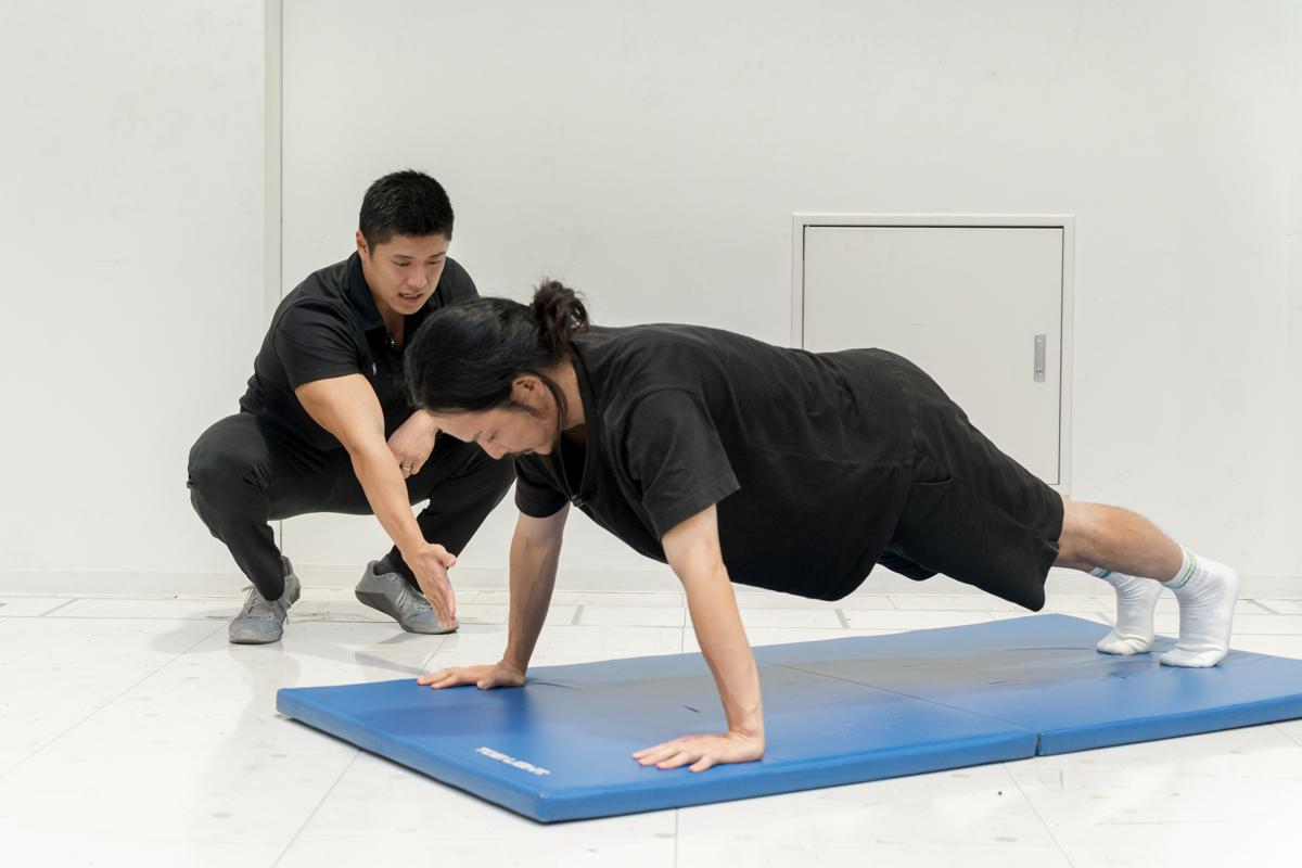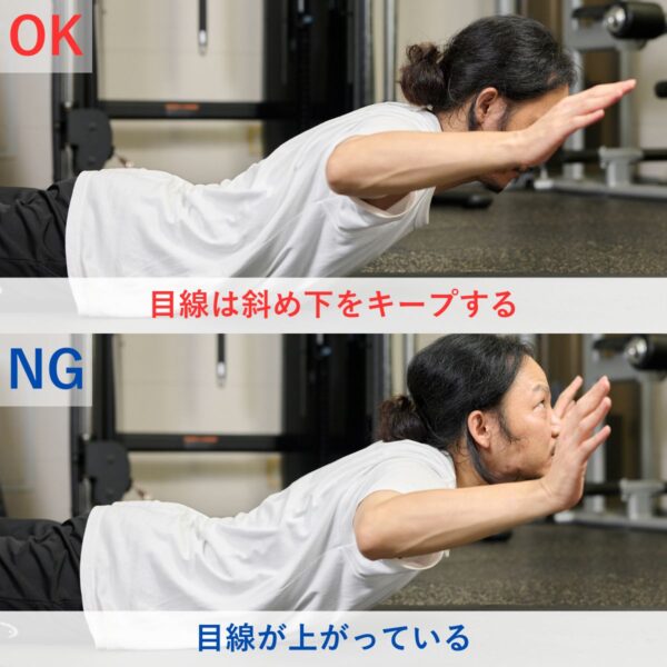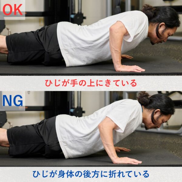 押すときは手のひら全体で床を押す意識を持つと肩が安定します。肩甲骨の「寄せ・離し」をコントロールしながら、反動を使わないように取り組みしましょう。