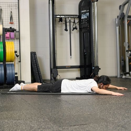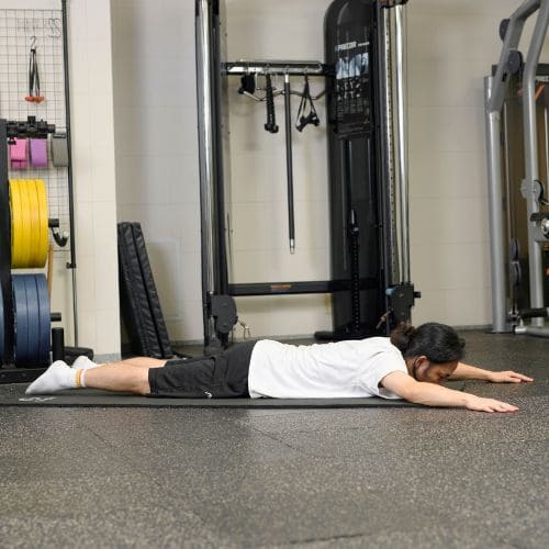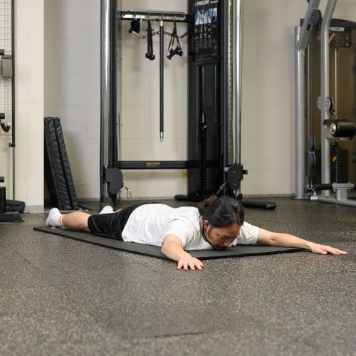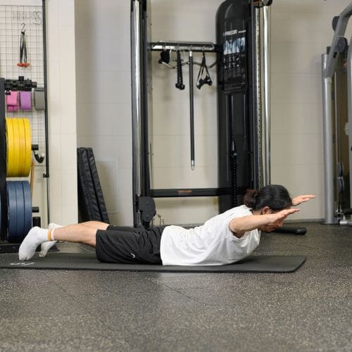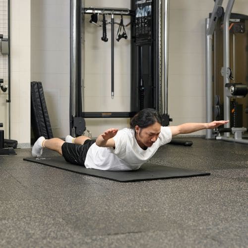 「高く上げる」ことよりも、反動を使わずにコントロールする動きを意識しましょう。腰に違和感がある場合は、可動域を狭くする・片手・片脚を交互に上げるなどの種目から始めると安全です。