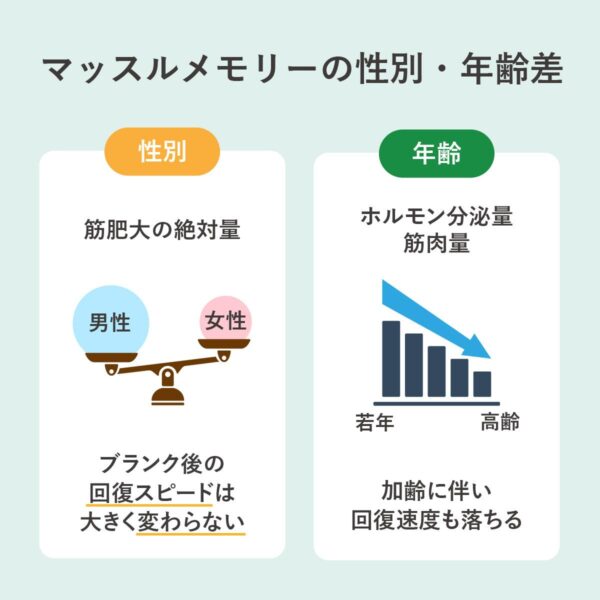年齢による違い | 加齢に伴いホルモン分泌量や筋肉量が減少するため、若年期と比べると回復速度は落ちる。しかし、「筋肉の記憶」によって未経験の同年代よりも回復が早いことも報告されている。 |