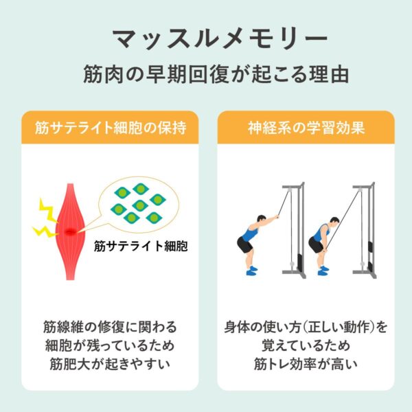 マッスルメモリーは、筋サテライト細胞(※)の保持・神経系の学習効果の2つが主な要素と考えられている。