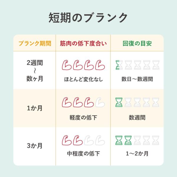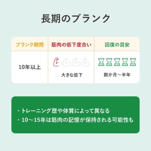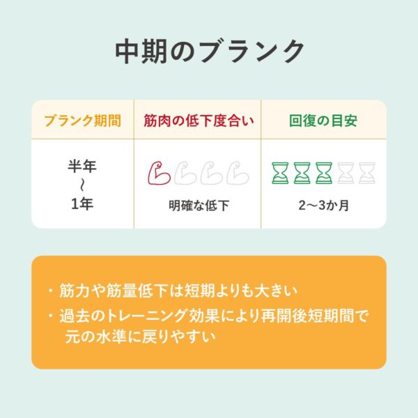 半年から1年程度のブランクでは、筋力や筋量の低下は短期の場合よりも大きくなる。しかし、過去のトレーニング効果が残っているため、再開後は比較的短期間(2〜3か月)で元の水準に戻る可能性は高い。