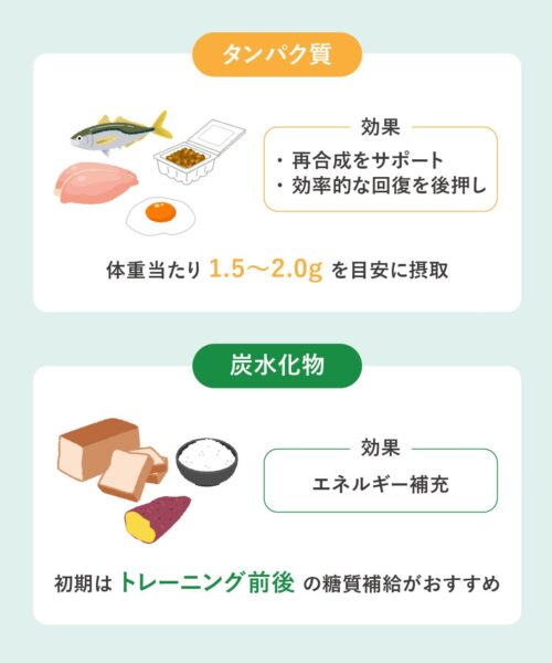 炭水化物 | エネルギー不足はトレーニング効果を削ぐため、適切な量を確保する。特に再開初期はトレーニング前後の糖質補給が効果的である。 |