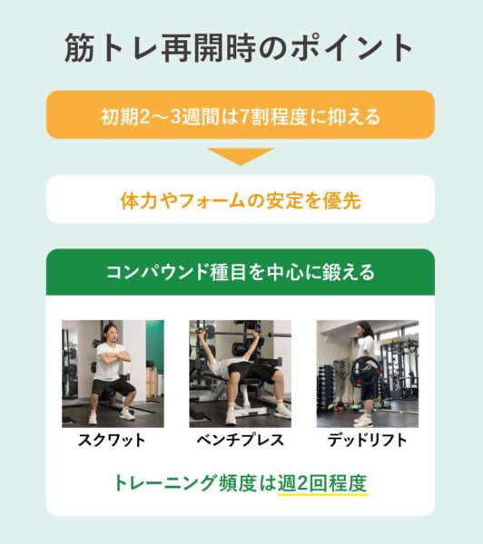 ブランク明けのトレーニングは、いきなり元の強度に戻すのではなく、リハビリのつもりで段階的に負荷を上げることが重要です。特にスクワットやベンチプレス、デッドリフトのようなコンパウンド種目は、複数の関節と筋群を使うため、痛みが出ない重量や可動域にとどめるのが安全です。