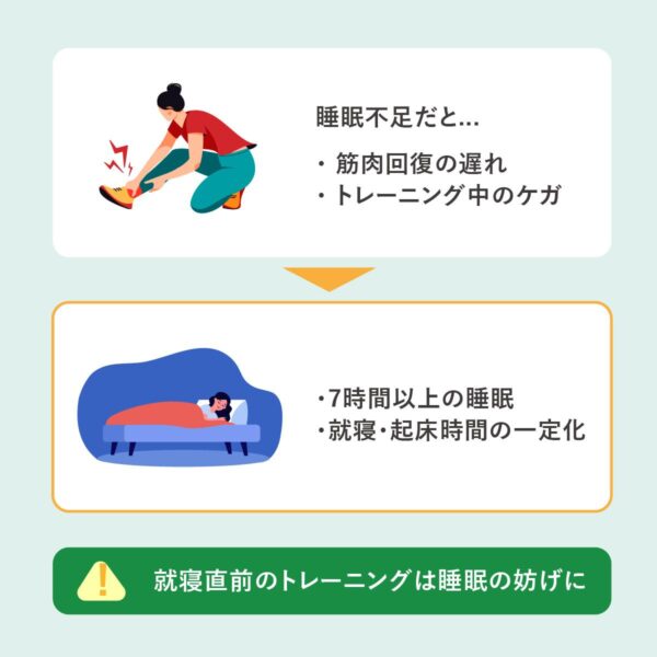 十分な睡眠は、筋肉の回復やケガの防止の観点で重要。どのくらい寝るべきかは個人差があるので、日中の眠気がないことを基準に(一般的には7時間以上)。