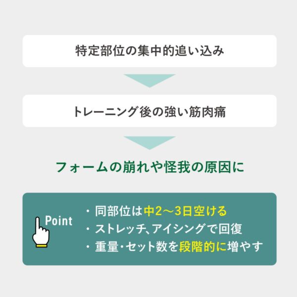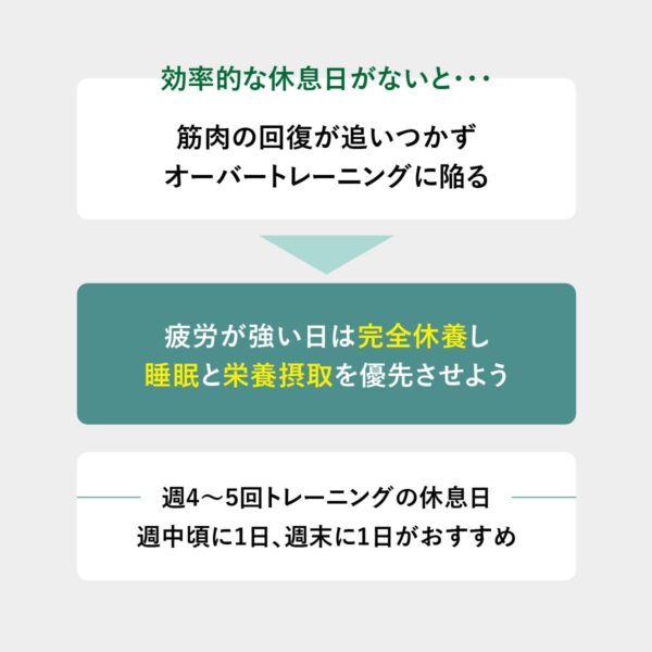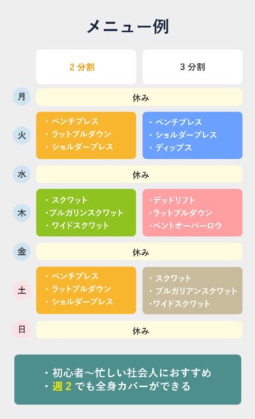 - 1部位あたりのトレーニング量を確保しながら、十分な休息日も取る