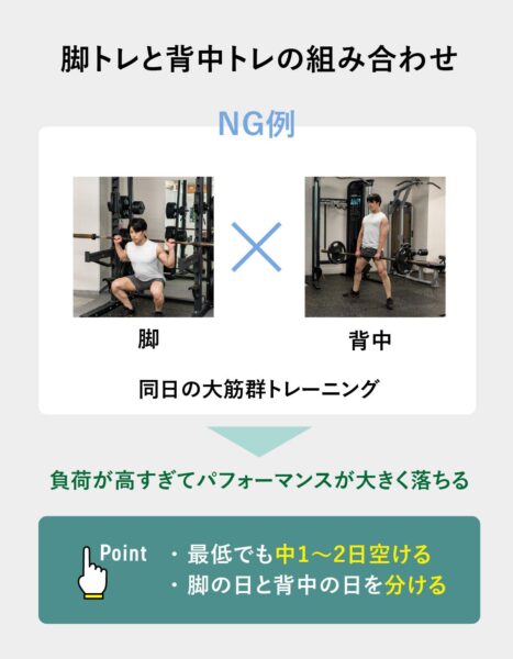 脚と背中のトレーニングはどちらもエネルギー消費が大きく、同日に組み合わせるとオーバーワークになることもあります。腕などの小さな筋群については、目的に応じて柔軟に組み合わせても問題ありません。