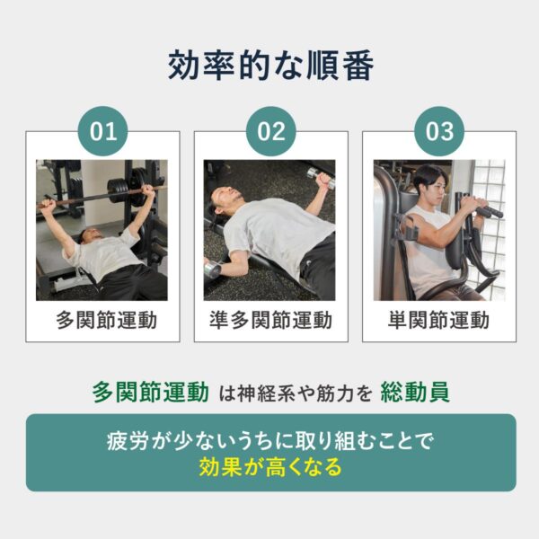 効率的にトレーニングをおこなうためには、多関節運動から単関節運動へと進める順番が効果的とされる。スクワットやベンチプレスなどの多関節運動は神経系や筋力を総動員するため、疲労が少ないうちに取り組むことで効果を高められる。