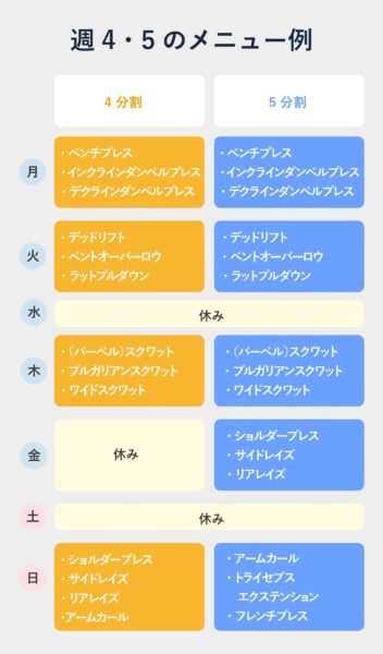 週4~5回の分割法は、筋肥大を目指す中級者以上に適した方法。1部位あたりのトレーニング量を確保しながら、十分な休息日も取るのがポイント。