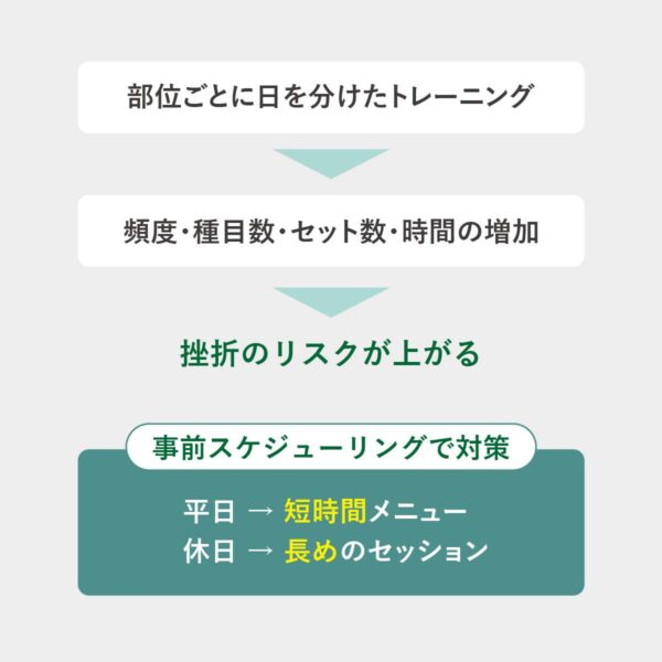 - 平日は短時間メニュー、休日に長めのセッションで分割法を実践