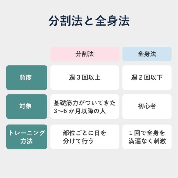全身法は1回のトレーニングで全身を満遍なく刺激する方法で、初心者や週1~2回しかジムに通えない人に向いている。一方、分割法は胸・背中・脚など部位ごとに日を分けておこなう。1回あたりのボリュームを増やせるため、筋肉の細部まで追い込むことが可能。週の頻度が高い人や本格的に筋肥大を狙う人に適している。