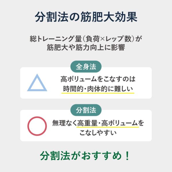 筋肥大効果を比較した研究では、分割法と全身法の総負荷量が同じなら効果に大差はないと報告されている。ただし中級者以上では、分割法によってより高重量・高ボリュームを扱えるため、実質的に筋肥大が優位になる傾向がある。