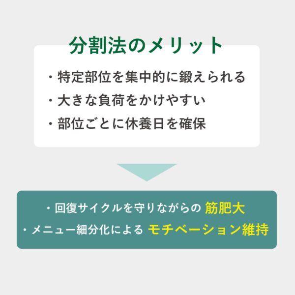 ・1部位に高負荷をかけやすい ・部位ごとの成長を狙える ・セット数・ボリュームを増やしやすい |