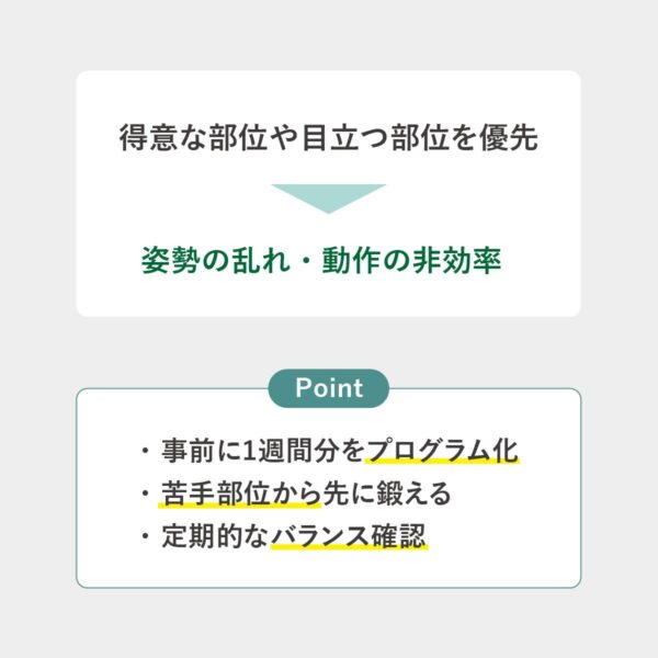 分割法は計画性が不十分だと、得意な部位や見た目に目立つ部位ばかりを優先しがちになる。結果として全体のバランスが崩れ、姿勢の乱れや動作の非効率につながる。筋力向上やボディメイクを目的とする場合、バランスの取れたプログラム設計が欠かせない。