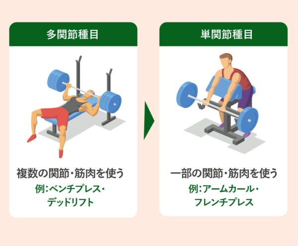 多関節運動は動作が複雑でエネルギーを多く使うため、疲労が少ない状態でおこなった方がフォームを安定させやすく、ケガのリスクも減らせます。トレーニングの後半に、単関節種目(アームカール・フレンチプレスなど)で細部を仕上げるようにすることで、効率的に全身を鍛えられます。
