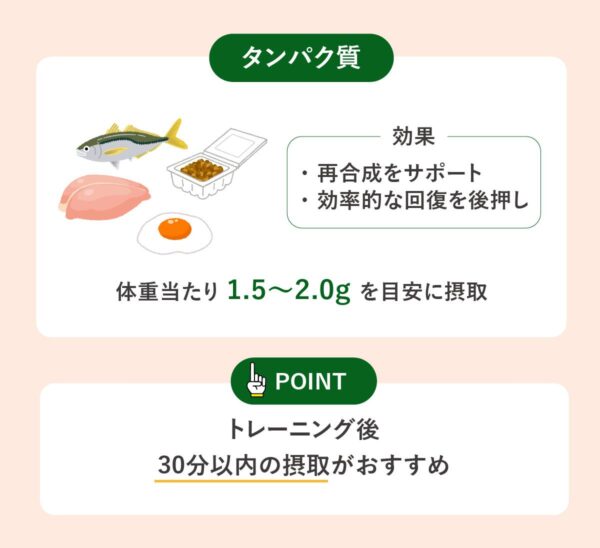 食事で摂るのが基本だが、忙しいときはプロテインで補うのもおすすめ。トレーニング後30分以内に摂取すると吸収が早く、より効果的に筋肉を育てられる。