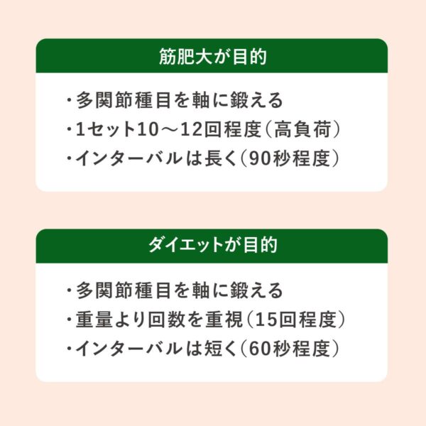 | 筋肥大 | 多関節種目を軸に中〜高負荷・中回数(例:10–12回)でトレーニング。インターバルは長め(1.5~2分)にする。 |