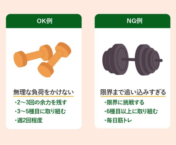 | 強度 | 2〜3回の余力を残す | 限界まで追い込みすぎる | 限界設定は疲労・フォーム崩れ・怪我のリスクを高める。 |