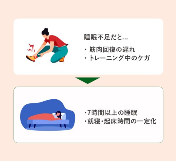 理想は1日7〜8時間の質の高い睡眠。寝る前にスマホやカフェインを避け、深い眠りを意識することで、筋肉の修復がスムーズに進む。「休むこともトレーニングの一部」と心得よう。