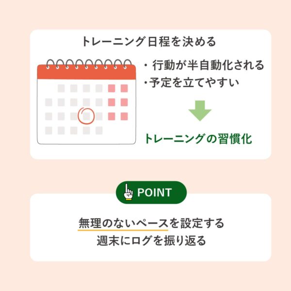 曜日固定(例:火・金)で予定に組み込むと、行動が半自動化し挫折しにくい。また、週末にログ(重量・回数・主観的強度)を振り返り、翌週の負荷やメニューを更新することで継続率がさらに上がる。