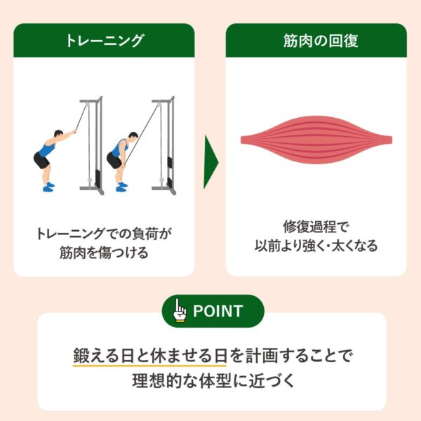 筋肉はトレーニングによって傷つけられ、そのあとの修復過程で以前より強く・太くなる。このサイクルを「超回復」と呼ぶ。筋肉はトレーニング中ではなく休んでいる間に成長するため、1週間単位で「鍛える日と休ませる日」を計画的に組むことが理想的な筋トレスケジュールに。