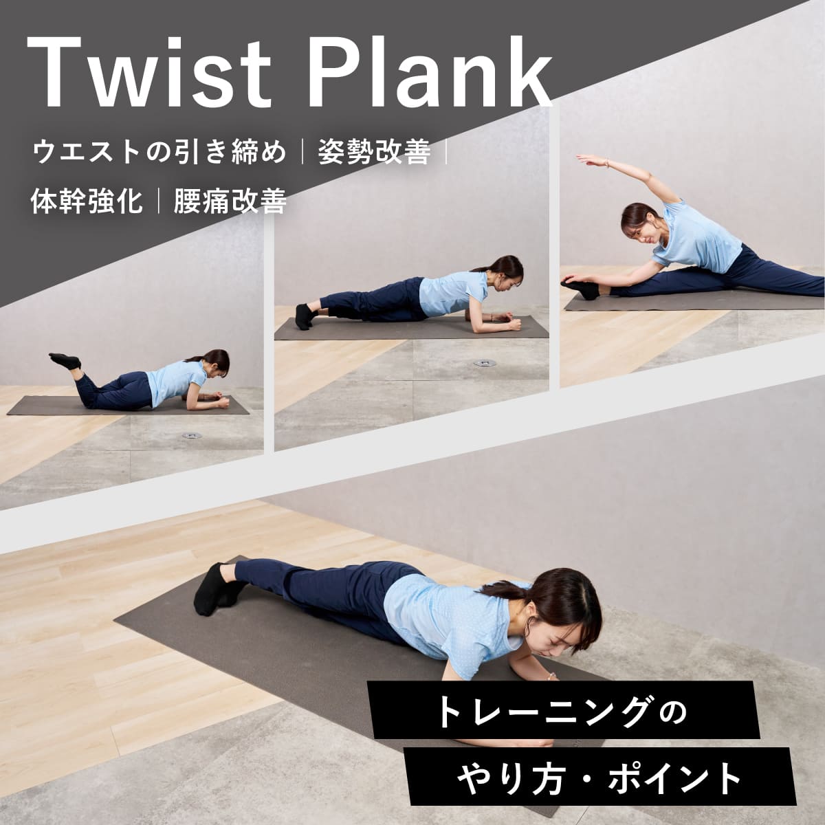 ツイストプランクは、体幹の安定性を高めながら腹斜筋を中心に鍛えるトレーニング。ひねり動作を入れることでウエストの引き締め、姿勢改善、動作安定につながる。