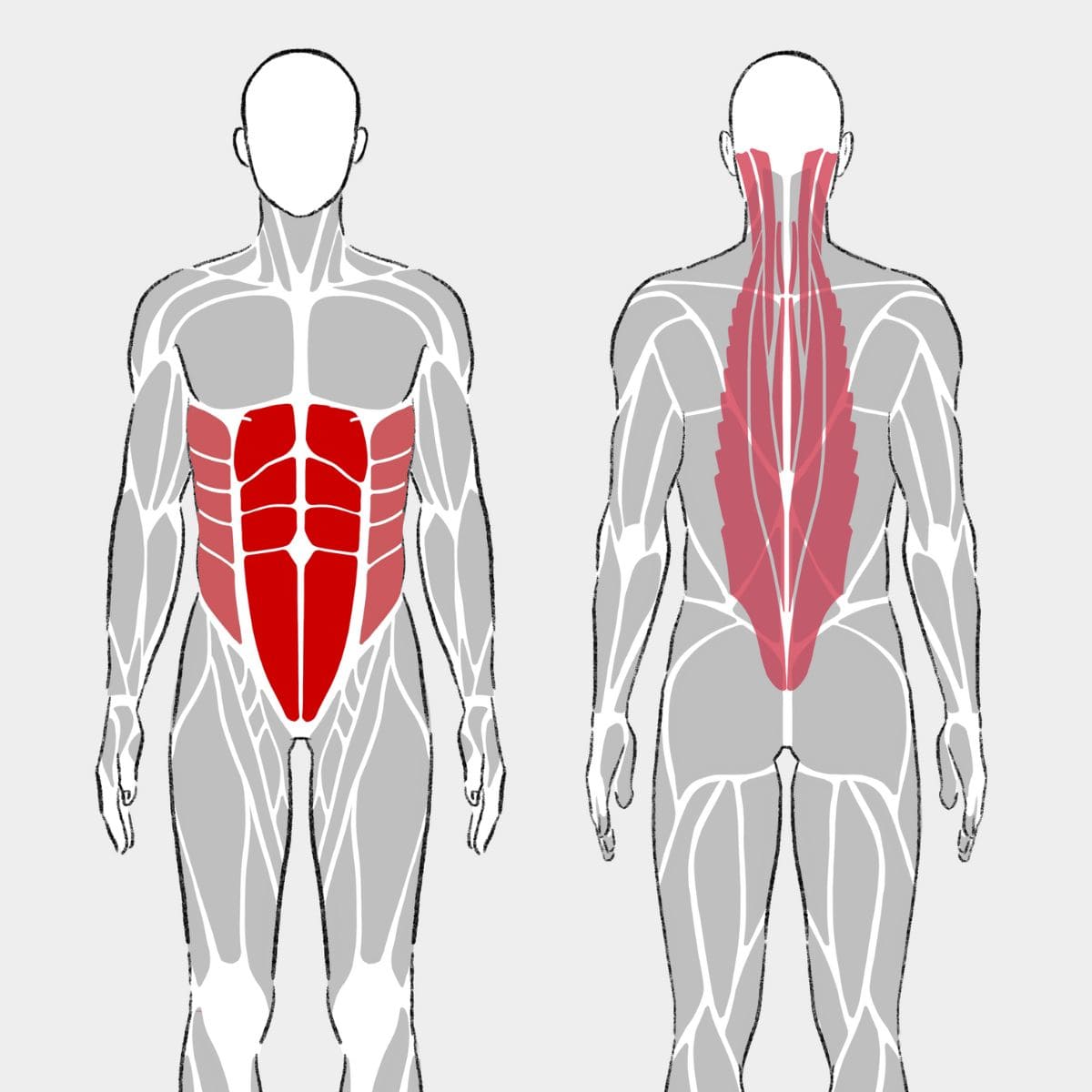 | 主な役割 | 身体を丸める動作や、正しい姿勢をキープする際に使われる。日常生活では、立つ時や座っている際に身体を安定させるのに不可欠な筋肉。 |