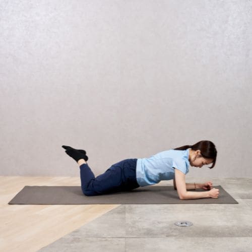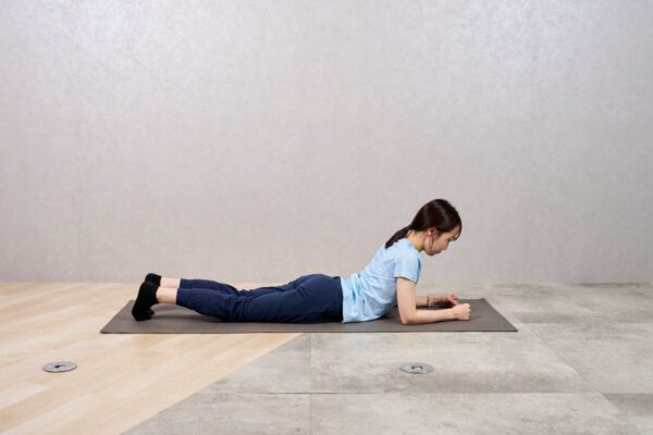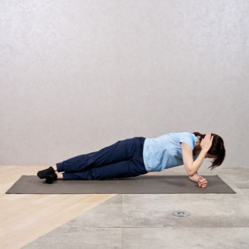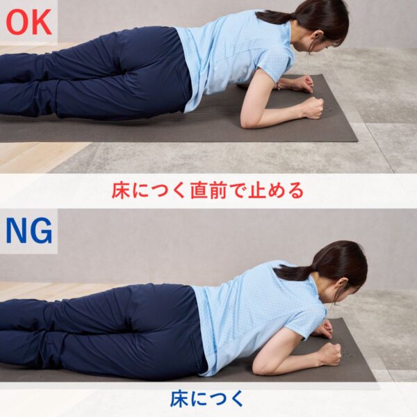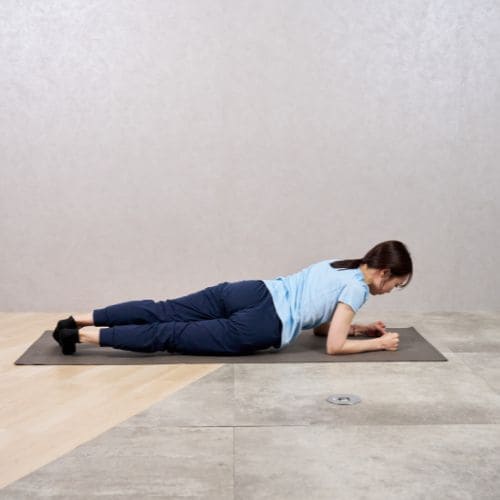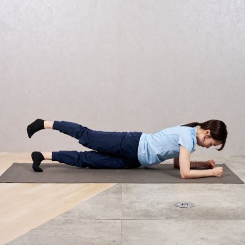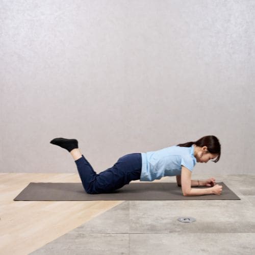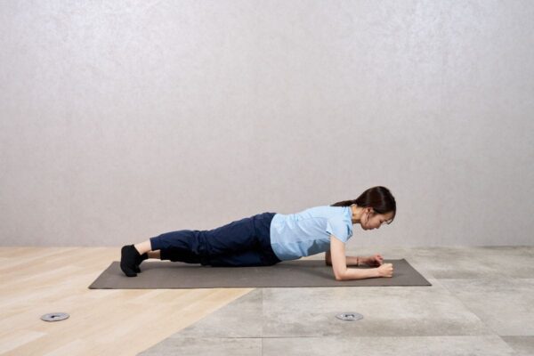 - ひざを床につけ、両肘を肩の真下に置いてプランク姿勢をつくる