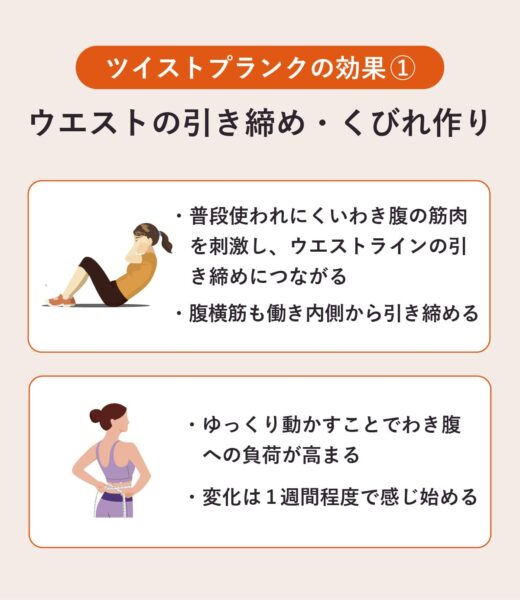 ツイストプランクは即効性よりも、習慣化による身体の変化が特徴です。くびれや姿勢改善だけでなく、疲れにくさや安定した動きも効果として現れます。焦らず、週単位での変化を見ていくのがポイントです。