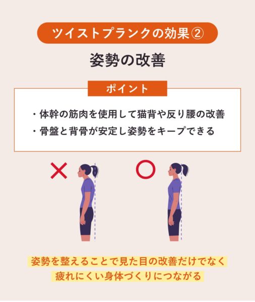 「ツイストプランク」は体幹の筋肉をバランスよく使うため、猫背や反り腰の改善につながる。とくに腹横筋や脊柱起立筋が連動して働くことで骨盤と背骨が安定し、自然と正しい姿勢を維持しやすくなる。