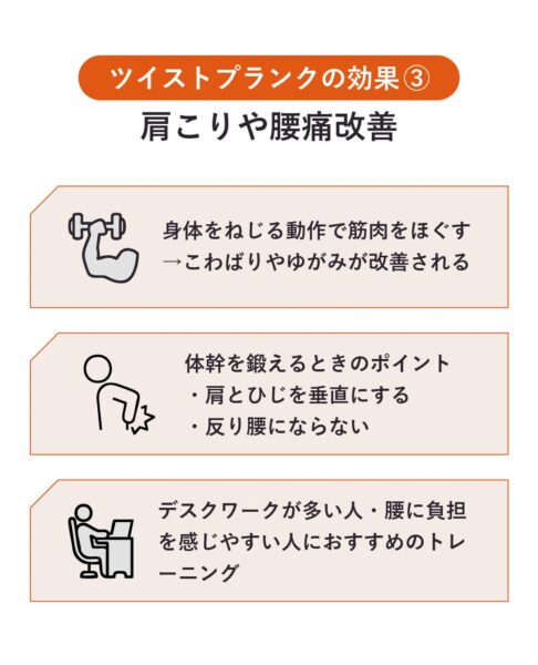ツイストプランクは、身体をねじる動作によって背中から腰にかけての筋肉をほぐし、体幹のバランスを整えるトレーニング。腹筋と背筋を均等に使うことで、筋肉のこわばりや姿勢の歪みを防ぎ、肩こりや腰痛の予防につながる。