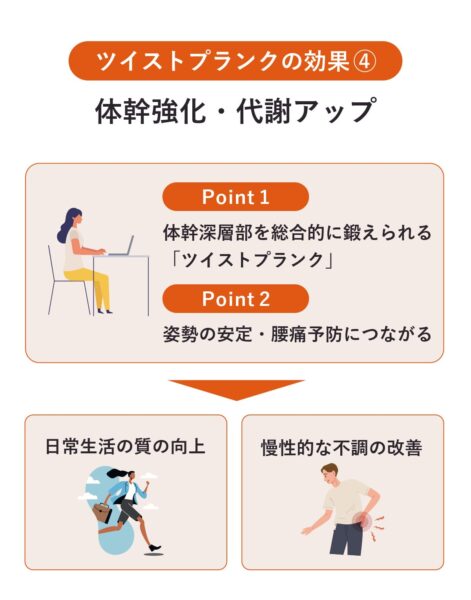 「ツイストプランク」は、腹斜筋・腹横筋・腹直筋・脊柱起立筋などの体幹深層筋を総合的に鍛えるトレーニング。体幹が強化されることで姿勢が安定し、転倒防止や腰痛予防につながる。