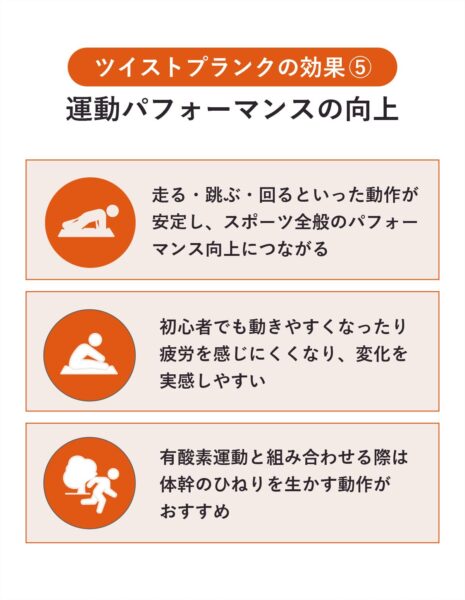 「ツイストプランク」で体幹を鍛えることで、走る・跳ぶ・回るといった動作が安定し、スポーツ全般のパフォーマンス向上につながる。体幹が強化されると、手足の動きを効率的に伝えられるため、力の出し方がスムーズになり、ケガのリスクも軽減される。