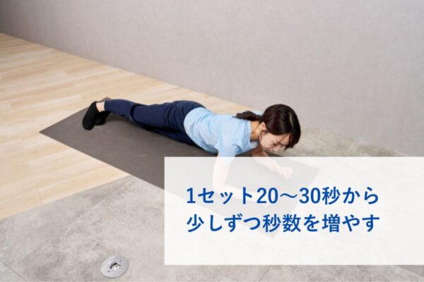 最初は初心者レベルから始め、軽々とできるようになったタイミングで秒数を5〜10秒延ばす、1セット追加することなど負荷を段階的に高めましょう。