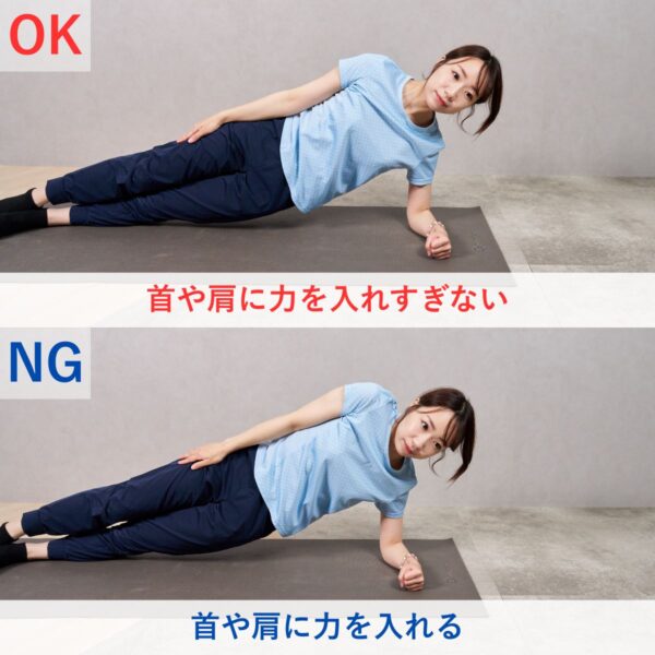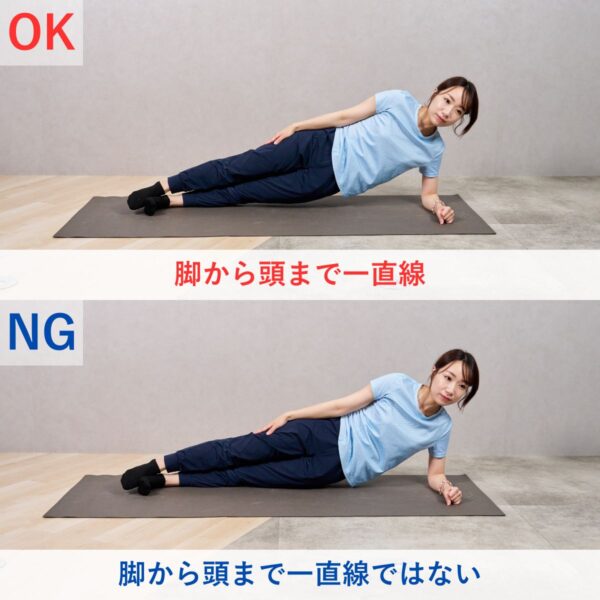 - ひじを肩の真下に置き、横向きで身体を一直線に保つ