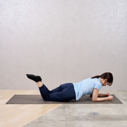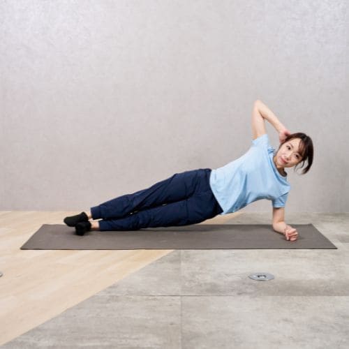 レッグリフトを加えることで、体幹と下半身の連動が強化されます。支える脚側の腹斜筋と臀筋が同時に働くため、体幹の安定性向上や姿勢改善に効果的です。