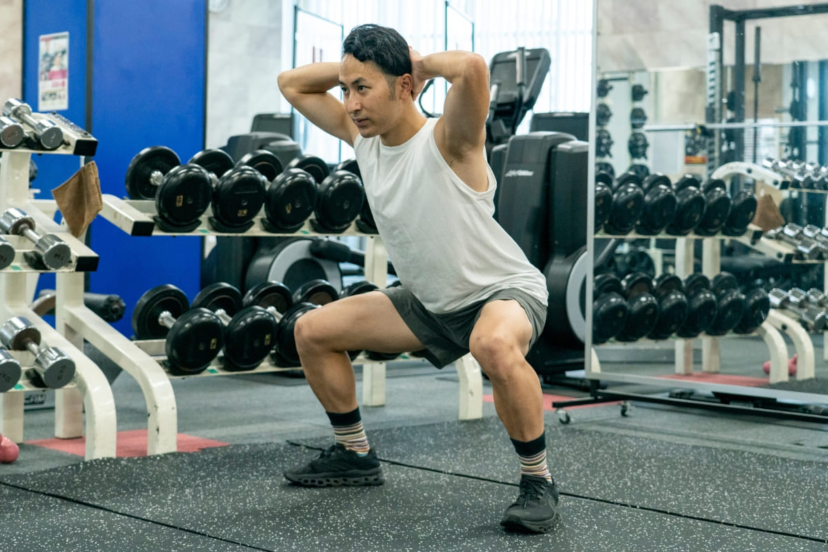 ひざを深く曲げると、普段使えていない筋肉に効いている感覚が得られます。ただ、深く下げすぎると腰に違和感が出ることもあるため、無理のない範囲で動かすことが大切だと感じました。