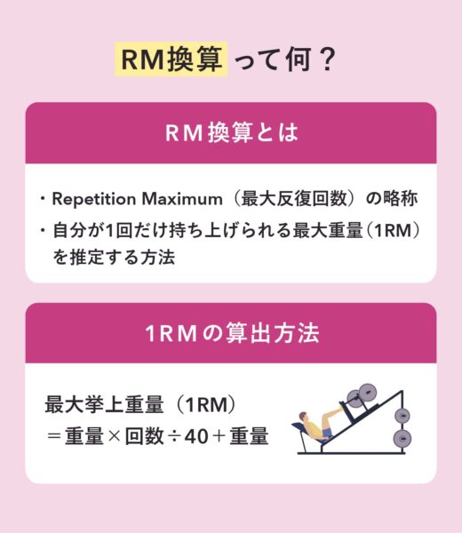 RM換算とは「Repetition Maximum(最大反復回数)」の略称で、自分が1回だけ持ち上げられる最大重量(1RM)を推定する方法。たとえば「10RM」であれば、10回持ち上げるのが限界の重さを意味する。