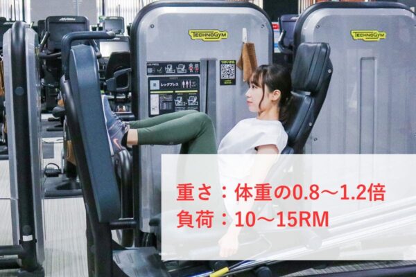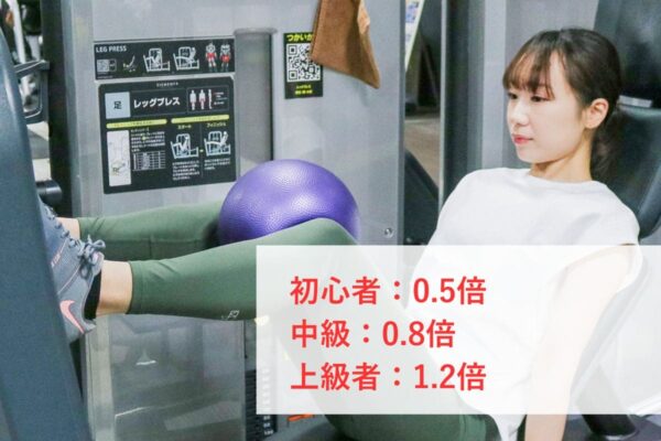 初心者はまず体重と同じくらいの重量からはじめましょう。たとえば体重60kgなら、レッグプレスも60kg前後でフォームを安定させる練習を優先するのがポイントです。