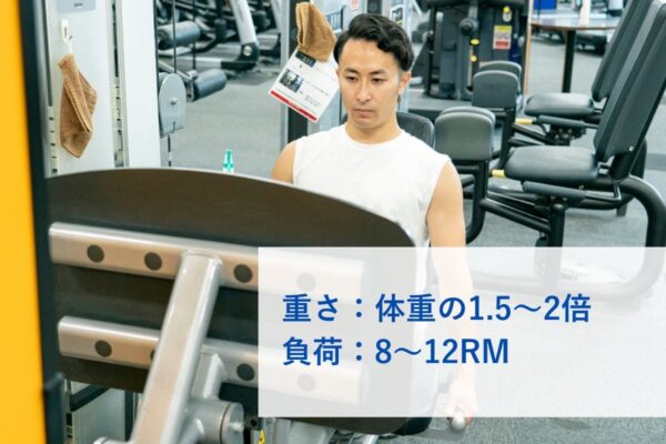 体重の0.5〜0.7倍程度を目安に、ひざや腰への負担を抑えながら動作を丁寧におこなうのが基本。ポイントは、可動域をしっかり使い、ゆっくりと動かすこと。筋肉を痛めずに刺激を入れたいときは、テンポよりもフォームの正確さを優先しよう。