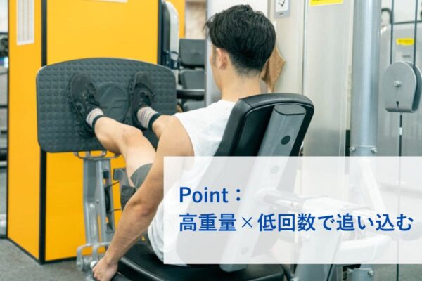 レッグプレスは深く沈み込むほど筋肉の伸張刺激が高まり、筋肥大の効率が上がります。腰が浮くような姿勢になった場合は、可動域をやや浅めに調整しましょう。