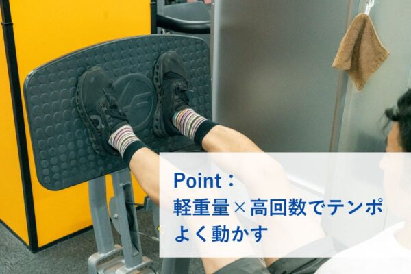 レッグプレスでは、「下ろす動作はゆっくり・押し出す動作は素早く」というリズムがおすすめ。スピードをコントロールすることで、筋肉の伸縮にしっかり刺激が入り、筋力アップや筋肥大効果が高まる。