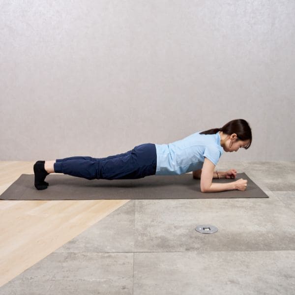 プランクは体幹全体を鍛える代表的な種目です。頭からかかとまでを一直線に保ち、腰が落ちたり反ったりしないよう注意が必要です。