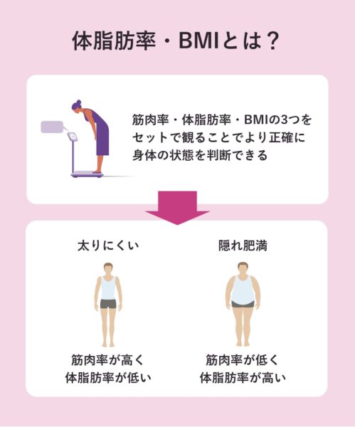 筋肉率・体脂肪率・BMIの3つをセットで見ることでより正確に身体の状態を判断することができる。例えば筋肉率が高く、体脂肪率が低い状態は「代謝が高く太りにくい身体」で、BMIが標準でも筋肉率が低く体脂肪率が高い場合は「隠れ肥満」の可能性もあるので注意しよう。