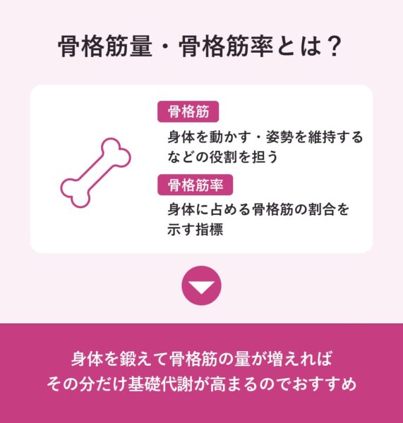 骨格筋は、「身体を動かす」「姿勢を維持する」「エネルギーを生み出す」といった役割を担っています。体を鍛えて骨格筋の量が増えればその分だけ基礎代謝が高まるので、ダイエットやトレーニングをする際は、この数値の増減にも気をつけるのがポイント。