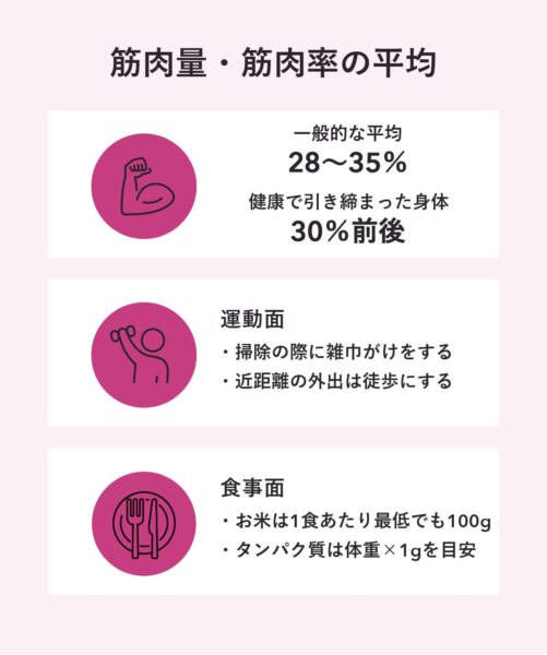 筋肉率は体組成計の測定条件(体水分量・時間帯など)でも変化するため、数値だけで一喜一憂せず、体調や動きやすさの感覚と合わせて判断することが大切です。