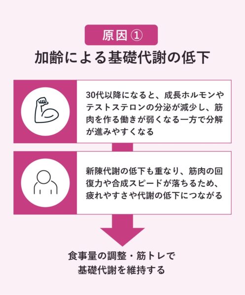新陳代謝の低下も重なり、筋肉の回復力や合成スピードが落ちるため、疲れやすさや代謝の低下につながる。