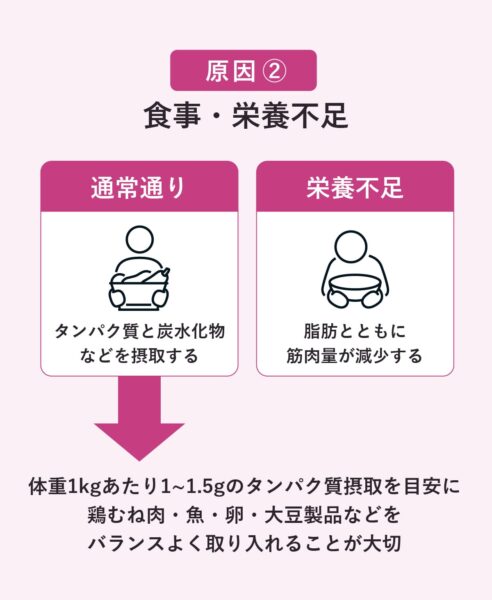 筋肉を維持・増やすには、食事からの栄養摂取が不可欠。十分なたんぱく質やエネルギーが不足すると、身体は筋肉を分解してエネルギー源にしてしまう。